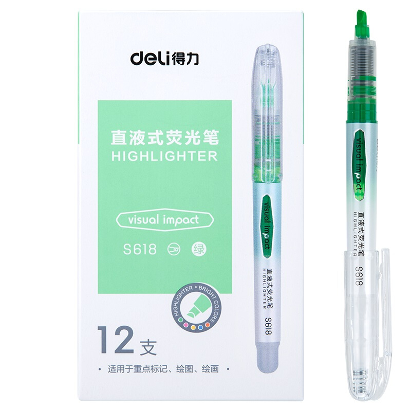 • 得力S618 绿色 直液荧光笔 重点标记 手帐可用水性记号笔 大包装 36支装