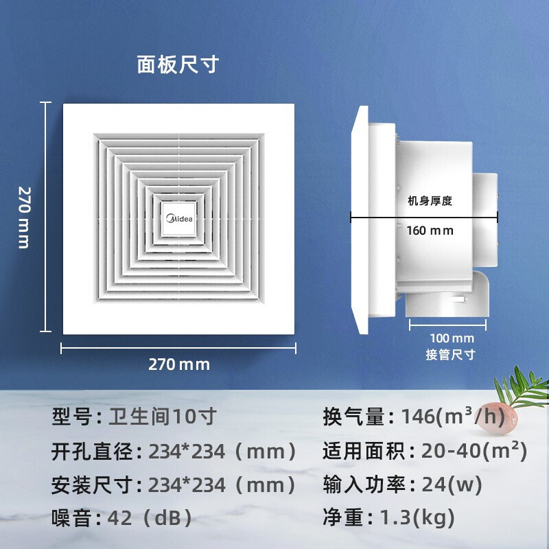 • 美的(Midea)换气扇卫生间排风扇厕所石膏板PVC吸顶嵌入式排气扇管道抽风机大风力普通吊顶10寸BPT10-22-QS