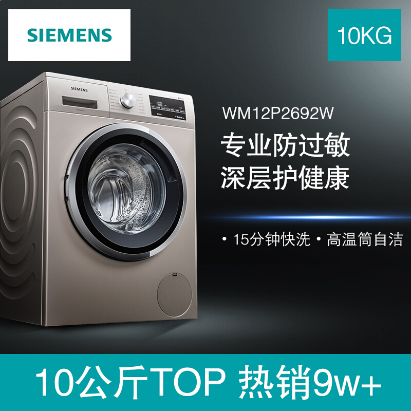 西门子(SIEMENS) 10公斤滚筒洗衣机 BLDC变频电机 15分钟快洗 混合洗 防过敏 XQG100-WM12P2692W