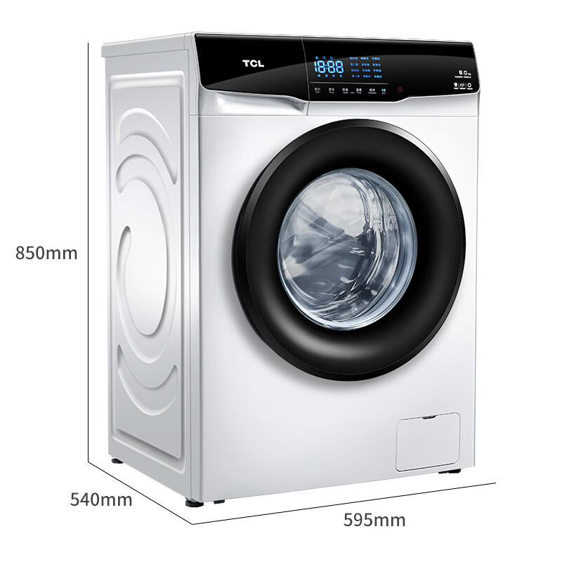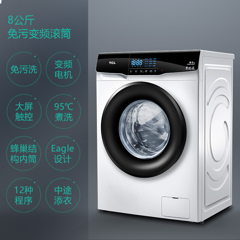 • TCL 8公斤 免污式免清洗变频全自动滚筒洗衣机 全面触控大屏 高温除菌除螨 皎月白 XQGM80-S300BJD