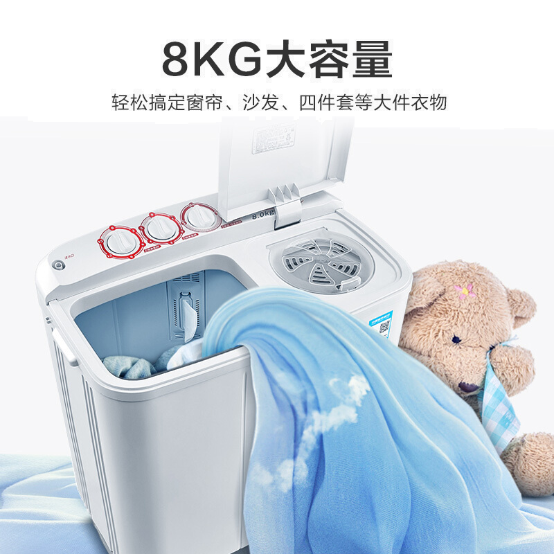 • 小天鹅TP80VDS08 双缸双桶洗衣机半自动 品质电机 强劲水流 三年包修 8公斤