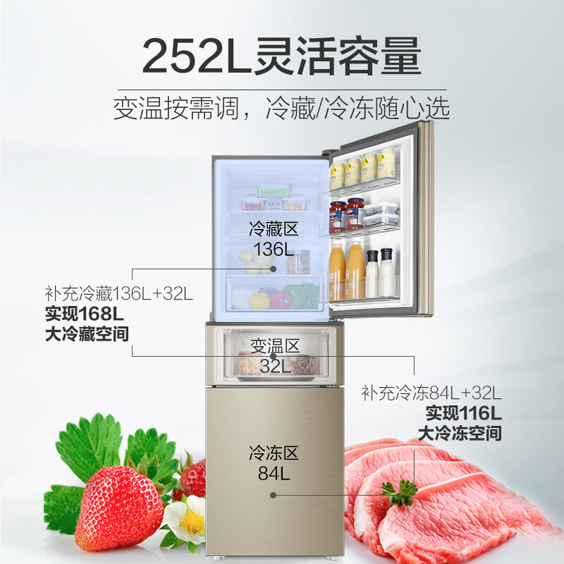 • 海尔BCD-252WXPS/252升 风冷无霜三门冰箱中门全温区变温DEO净味系统 环保材质