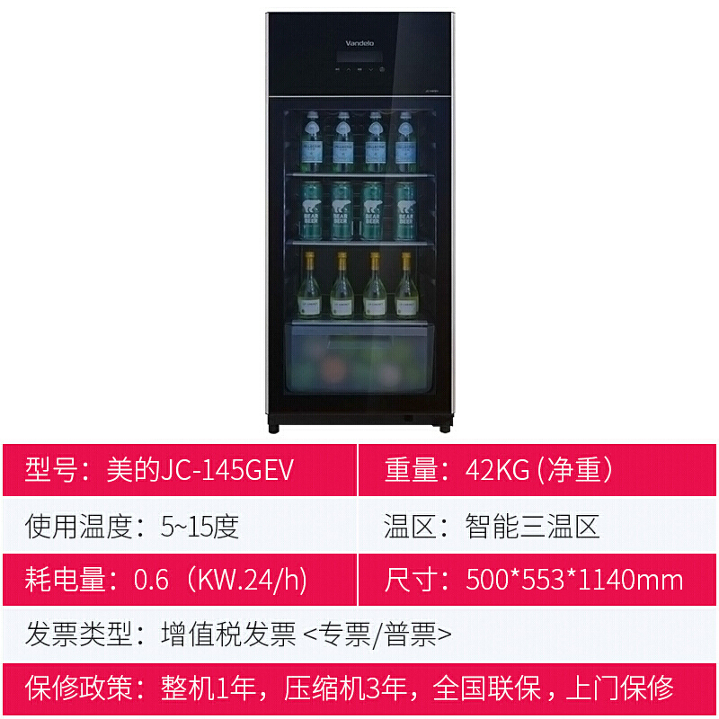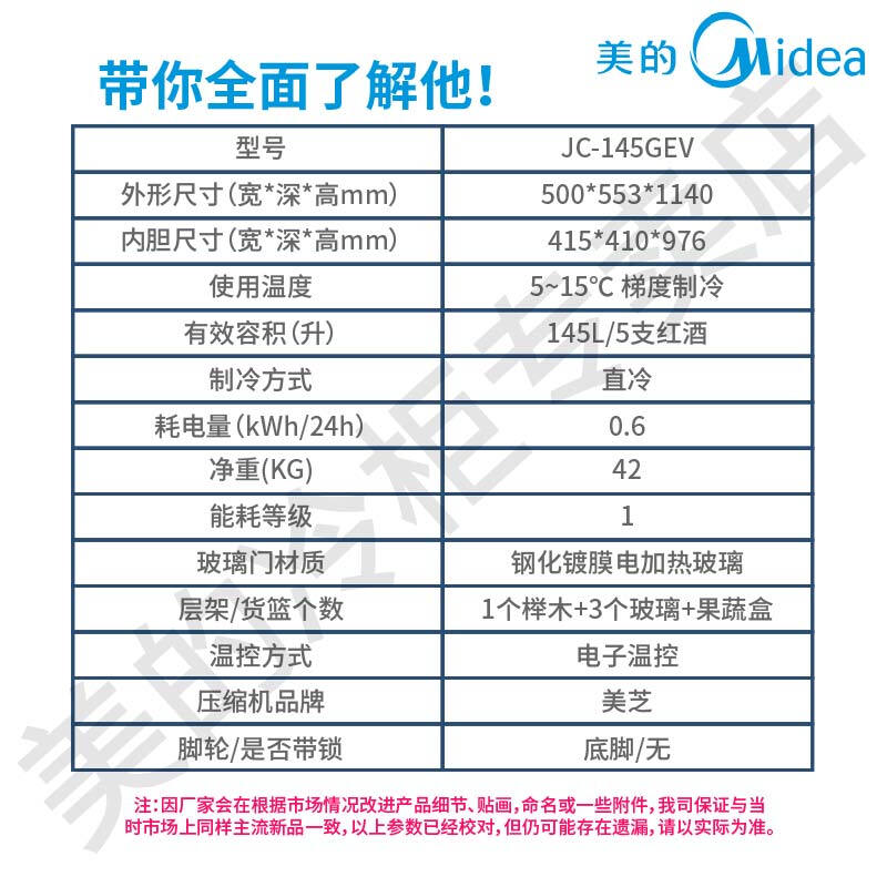 美的(Midea)家用冷藏柜红酒柜保鲜柜客厅立式玻璃办公室冷柜一级节能省电低音智能酒柜 JC-160GEM升级冷冻室设计(高1.37米)