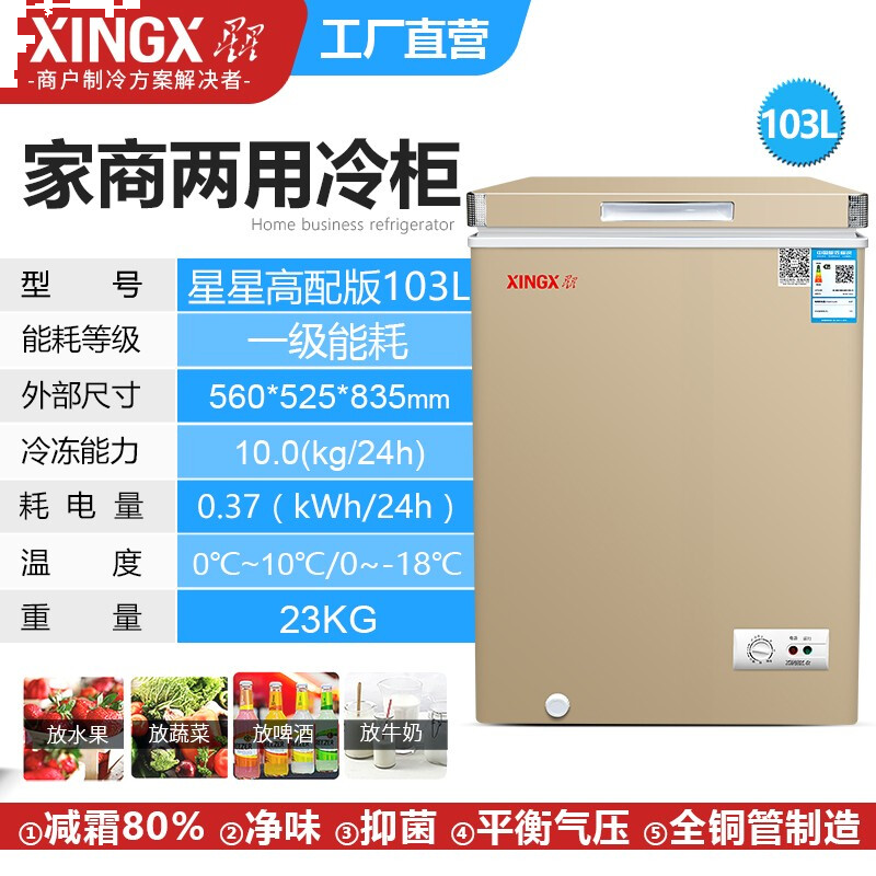 • 星星(XINGX)家用小冰箱 微霜节能小型冰柜 卧式商用单温冷藏冷冻柜 单箱速冻柜冷柜冻肉柜 103L金色款(自动减霜80%)