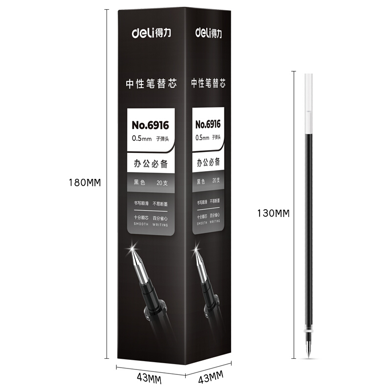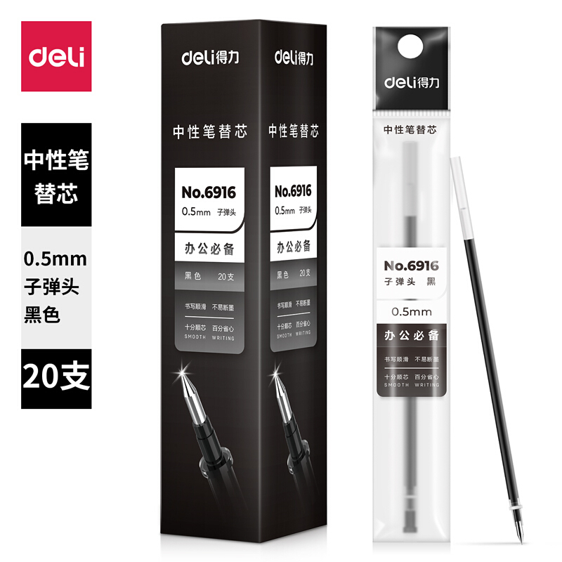 • 得力6916 黑色中性笔笔芯 0.5mm子弹头水笔签字笔替芯 20支/盒