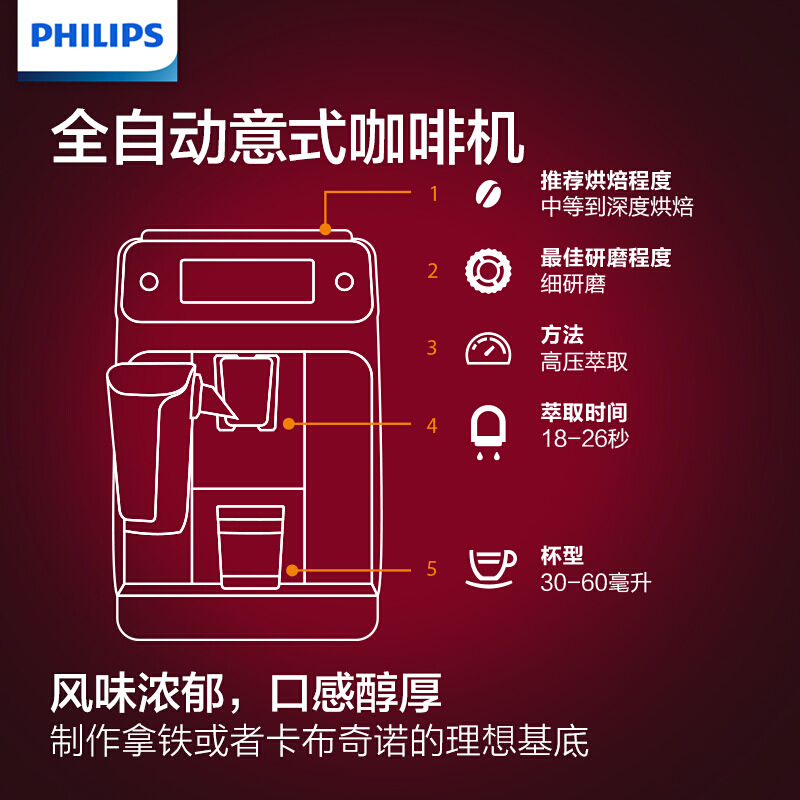 • 飞利浦 EP2136/72咖啡机 意式全自动Lattego家用现磨咖啡机 一键卡布奇诺自带奶壶