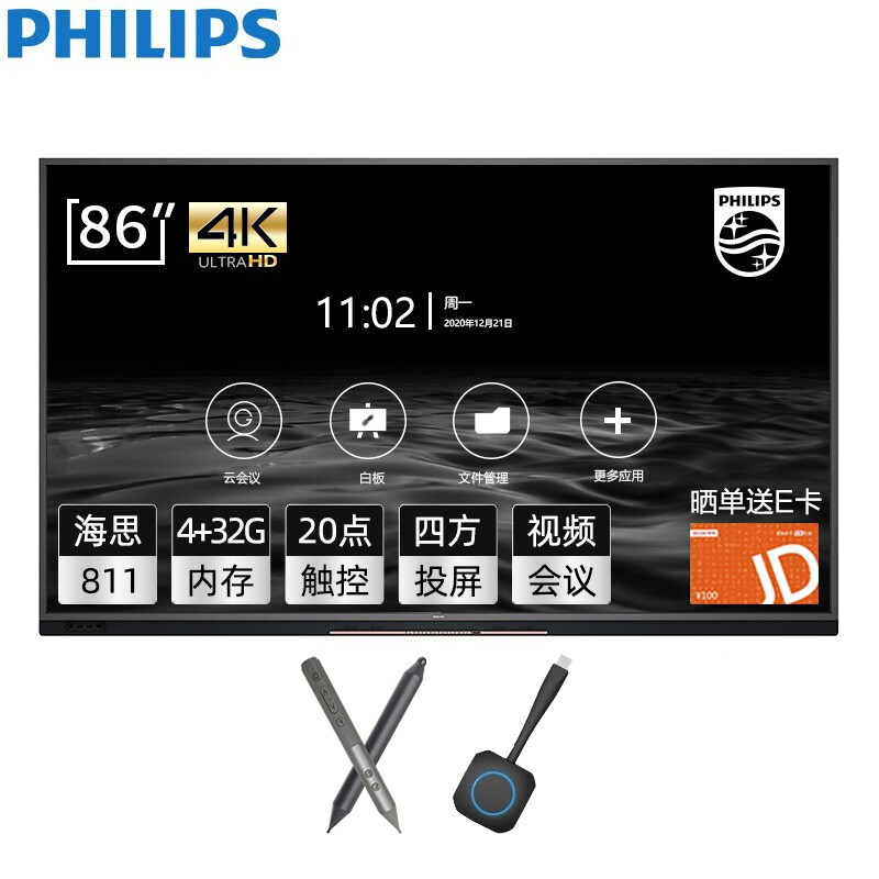 - 飞利浦86BDL3352T 86英寸会议平板 智能触摸屏教学一体机超薄电视商用智慧屏 +壁挂