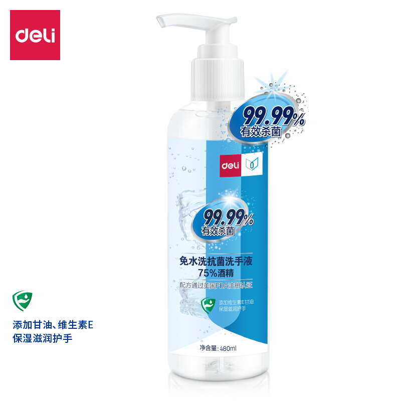 • 得力(deli)75%酒精免洗抑菌洗手液 学生儿童家庭抗菌消毒 滋润护手 480ml大瓶装 31002