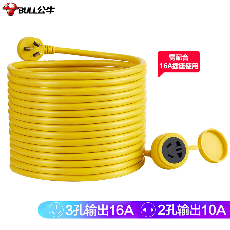 公牛(BULL)插座新能源电动汽车充电室外接线板电瓶车延长线16A插座20米