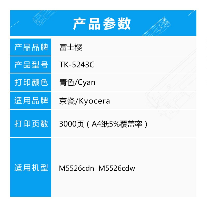 - 富士樱 TK-5243 C 青色墨粉 蓝色适用京瓷TASKalfa ECOSYS M5526cdn M5526cdw