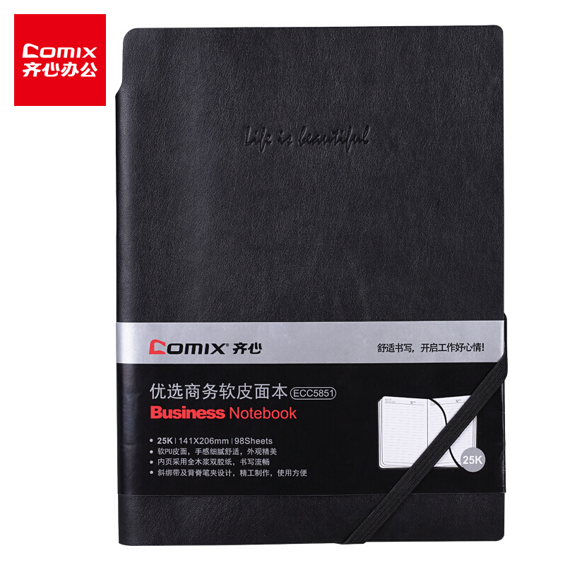 • 齐心(Comix) 软皮面创意斜绑带文具笔记本子/记事本/日记本 A5 98张 黑色 ECC5851