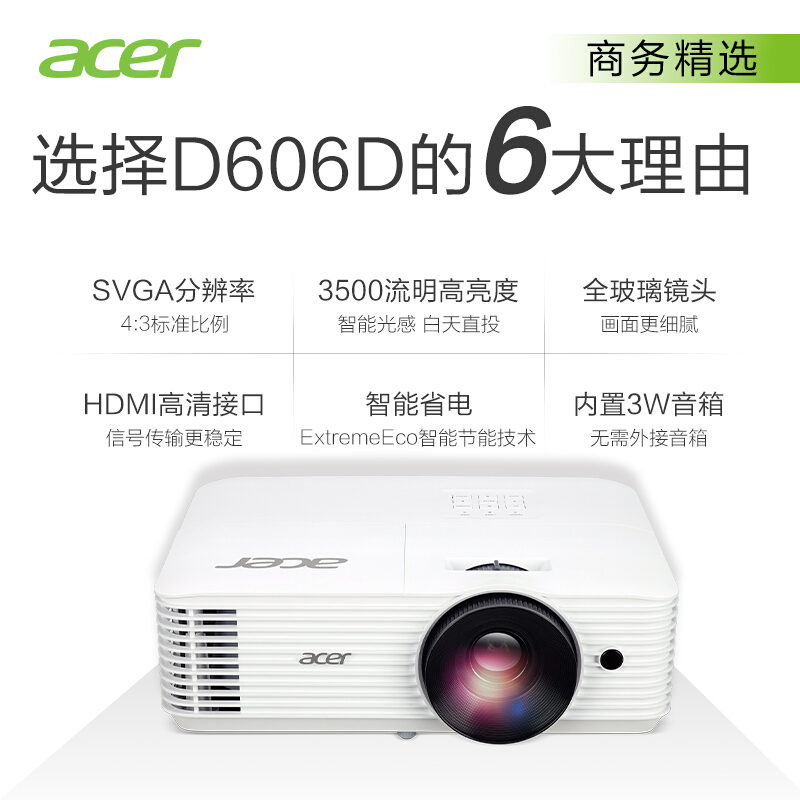 宏碁D606D 极光投影机 投影仪办公(普清SVGA 3500流明 标配HDMI 商用机皇升级 白天直投)