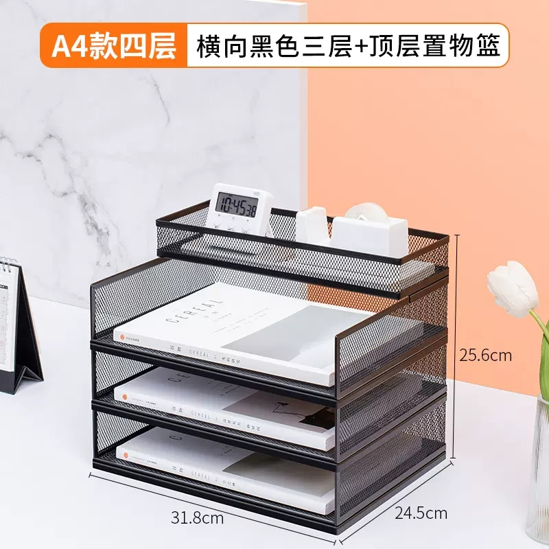 A4桌面文件架 四层横向黑色三层+顶层置物篮31.8*24.5*25.6cm