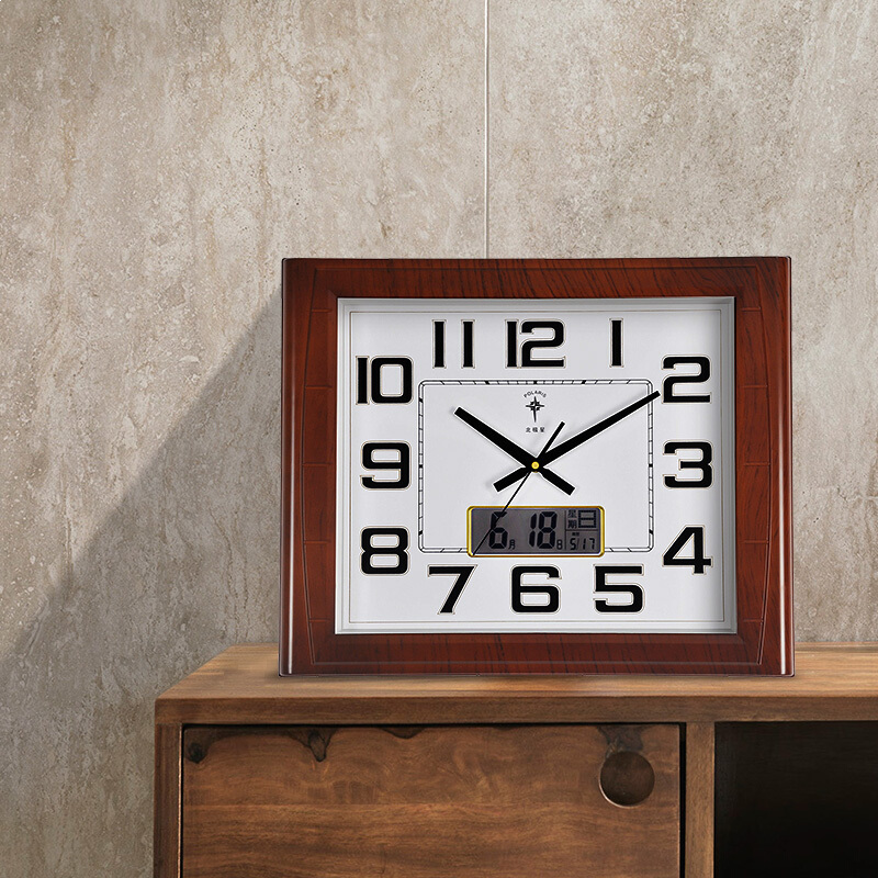北极星(POLARIS)挂钟客厅静音钟表超大方形万年历石英钟经典简约日历时钟挂表19英寸6812木纹