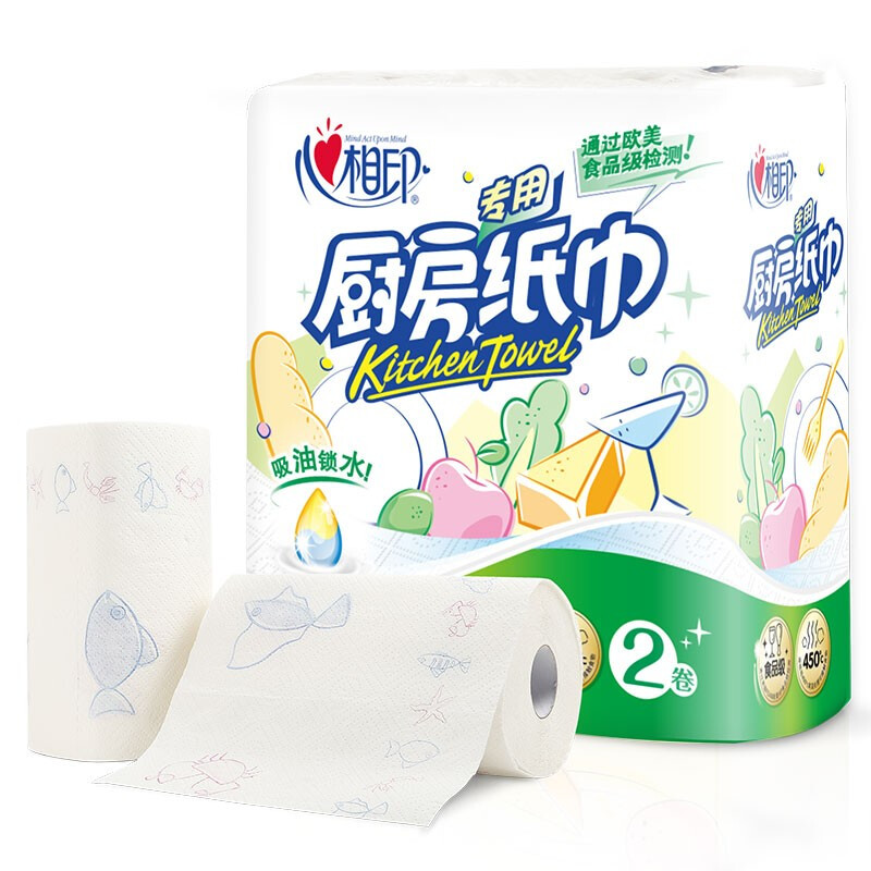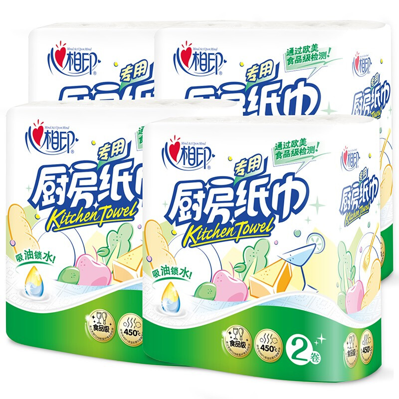 • 心相印 厨房用纸 吸水去油污专用清洁卷纸加厚擦手纸2卷*4提共8卷家用整箱装纸巾