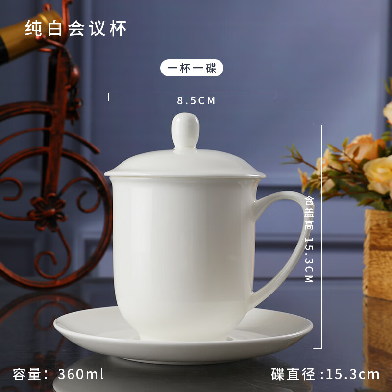 • 骨瓷盖茶杯360毫升办公杯水杯介杯带盖杯 纯白会议杯+碟