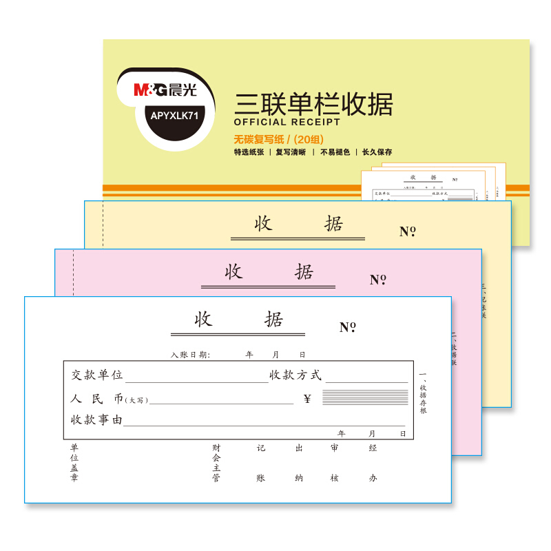 • 晨光APYXLK71 三联单栏收据 无碳复写收款收据单 财务手写单 办公用品 10本装