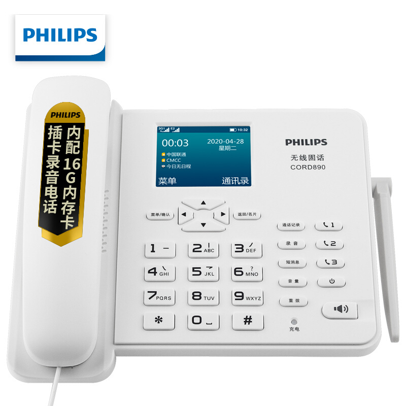 飞利浦(PHILIPS)插卡电话机 移动/联通固定插卡 自动录音座机 中文菜单 CORD890 白色16G版