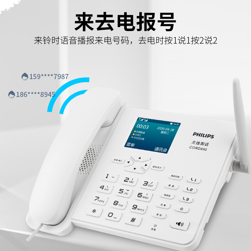 • 飞利浦(PHILIPS)插卡电话机 移动/联通固定插卡 自动录音座机 中文菜单 CORD890 白色16G版