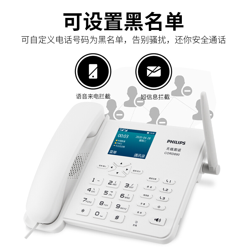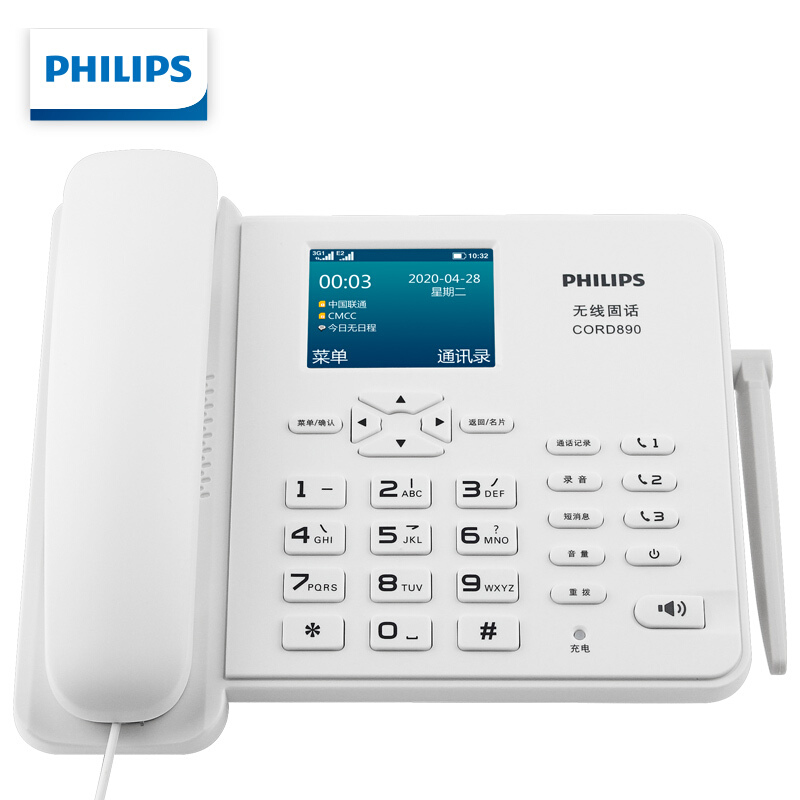 飞利浦(PHILIPS)插卡电话机 移动/联通固定插卡 自动录音座机 中文菜单 CORD890 白色普通版