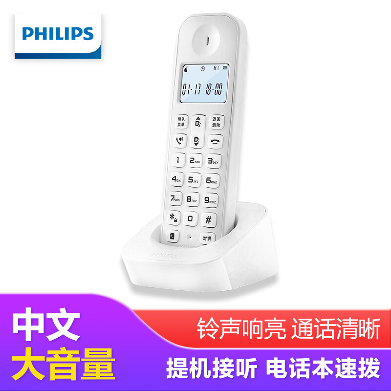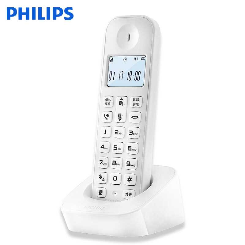 飞利浦 PHILIPS 数字无绳电话机/无线座机/单主机 白色屏幕背光 高清免提 家用办公 DCTG160(白色)