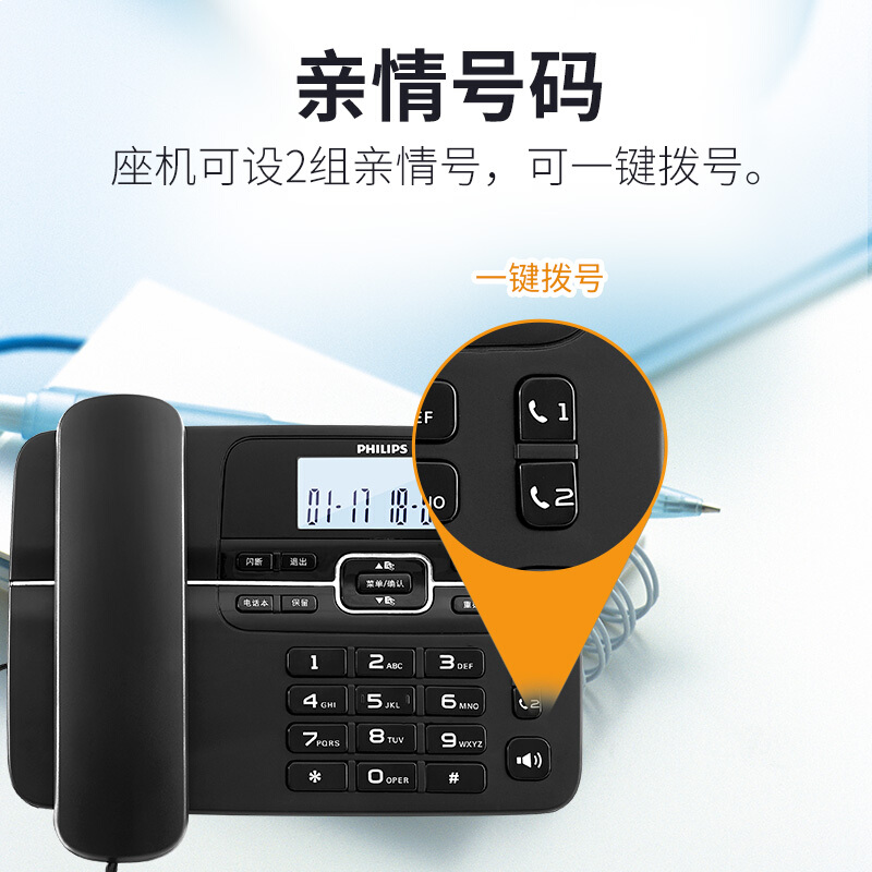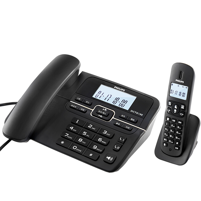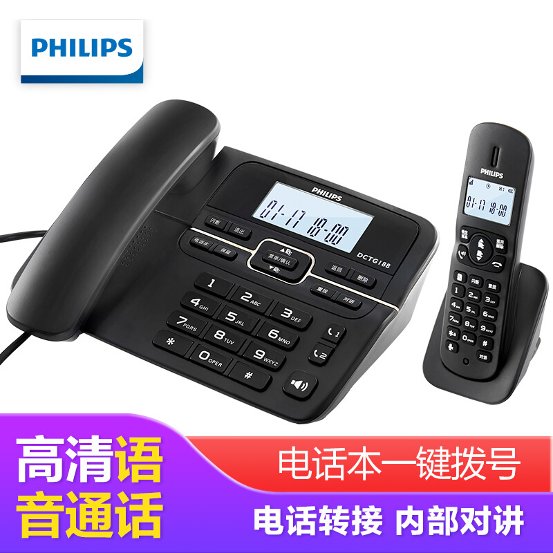 • 飞利浦(PHILIPS)数字无绳电话机无线固定座机电话子母机办公家用一键拨号/电话本 DCTG188 黑色(一拖一)