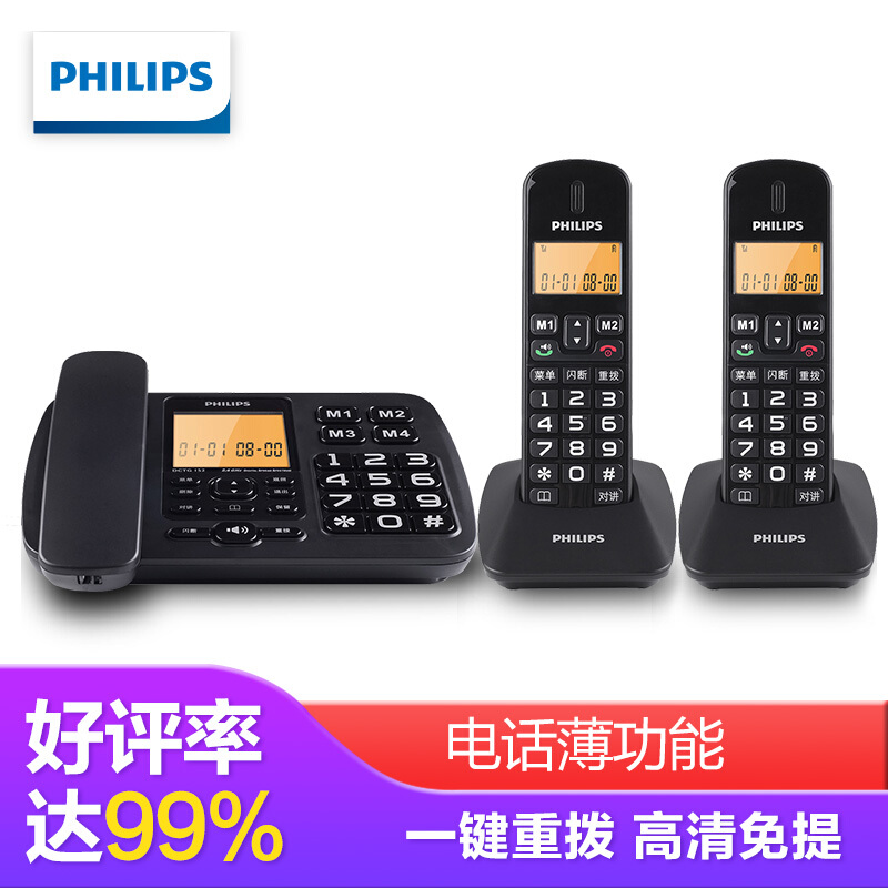 飞利浦无绳电话机家用子母机无线时尚办公固定电话座机一拖一二 DCTG152 黑色:一拖二