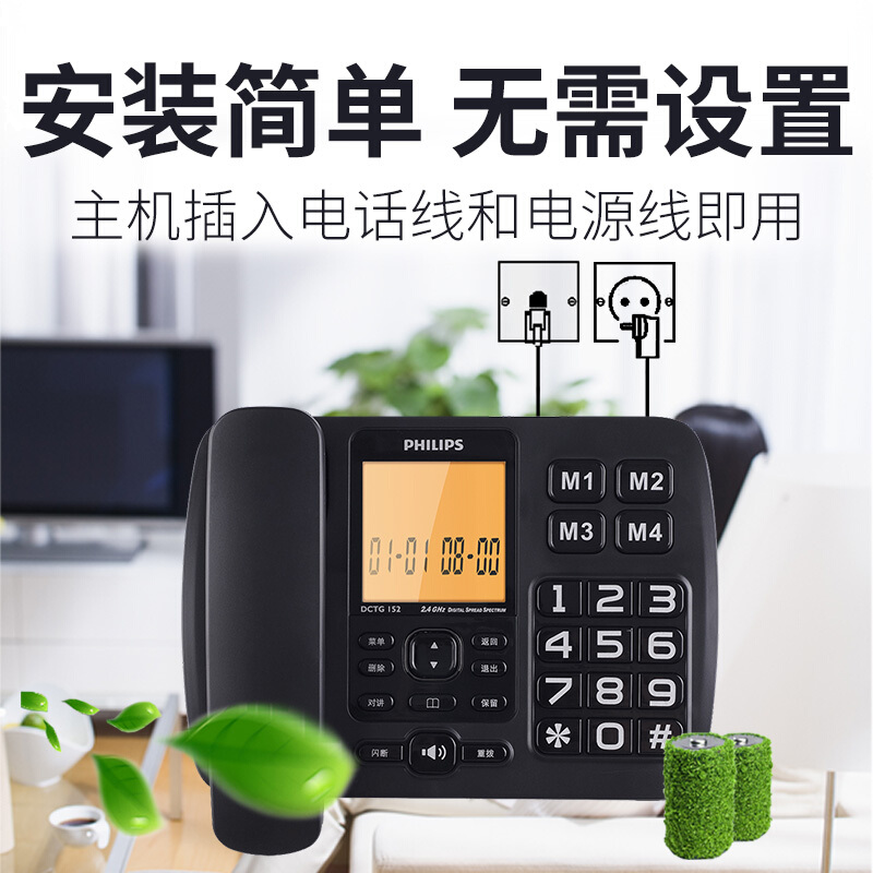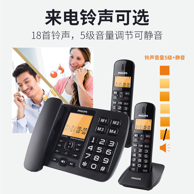 • 飞利浦无绳电话机家用子母机无线时尚办公固定电话座机一拖一二 DCTG152 黑色:一拖二
