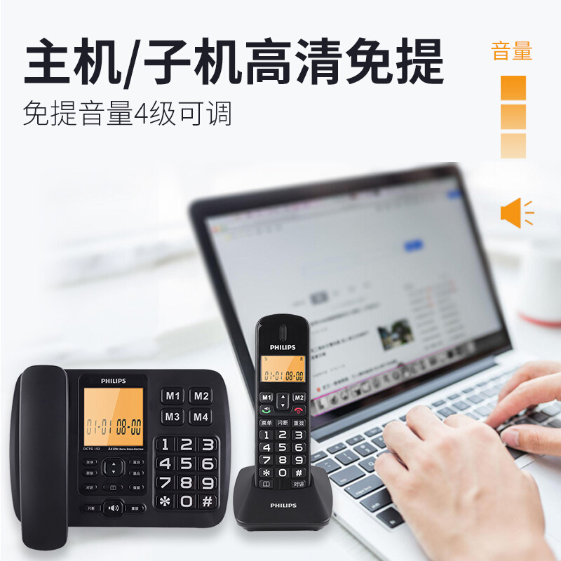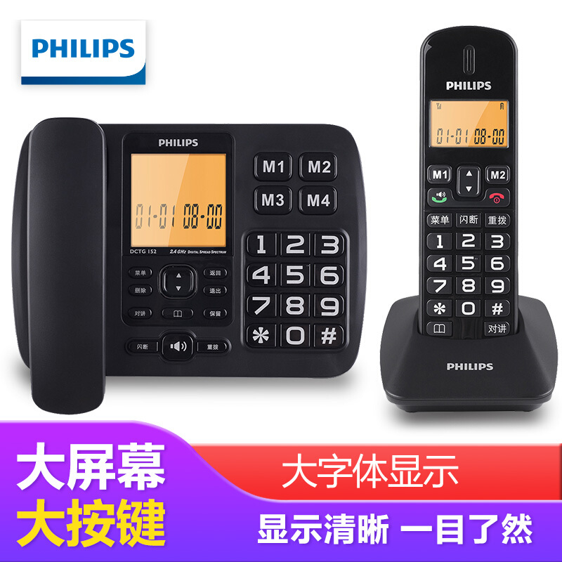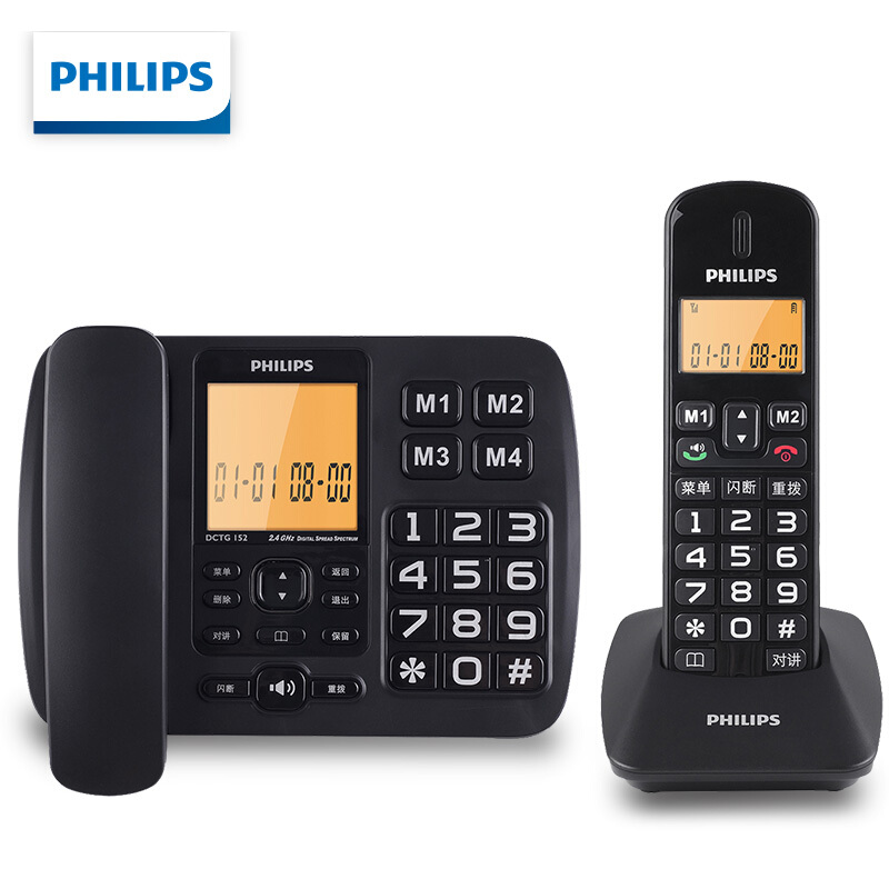• 飞利浦(PHILIPS)无绳电话机 无线座机 子母机 办公家用 一键拨号 内部对讲DCTG152一拖一 (黑色)