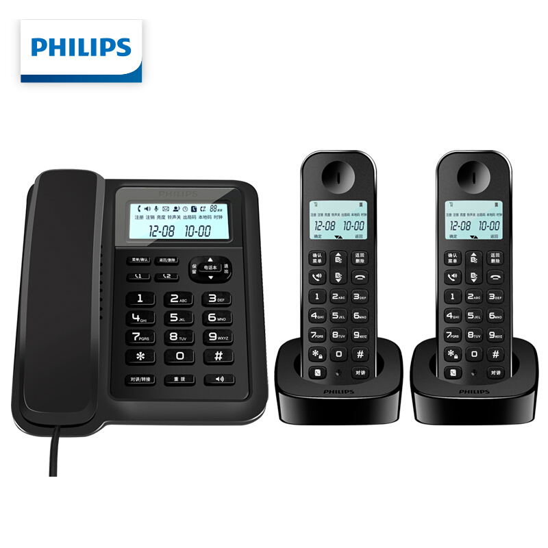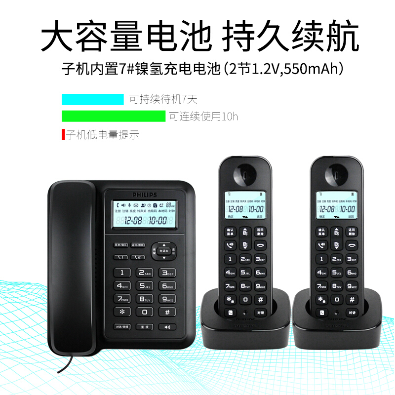 • 飞利浦(PHILIPS)数字无绳电话机 无线座机 子母机 办公家用 信号覆盖广 屏幕白色背光 DCTG167一拖二黑色