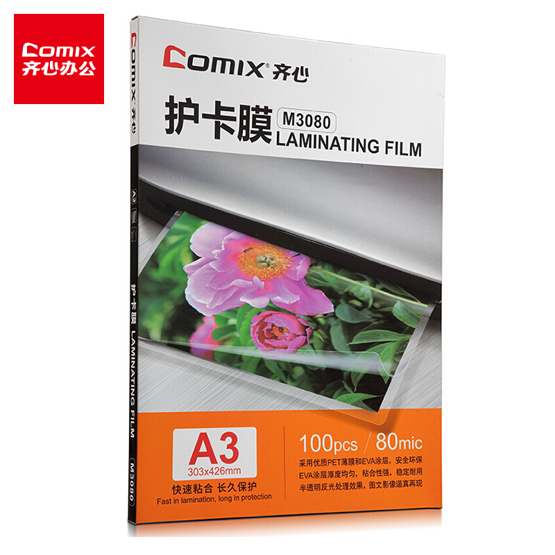 齐心(Comix)M3080 A3 80MIC 透明高清照片塑封膜 相片护卡膜 过塑膜100张/盒