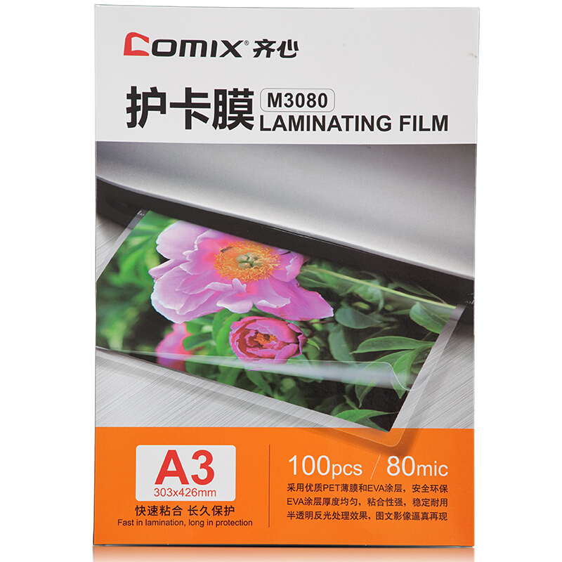 • 齐心M3080 A3 80MIC 透明高清照片塑封膜 相片护卡膜 过塑膜100张/盒