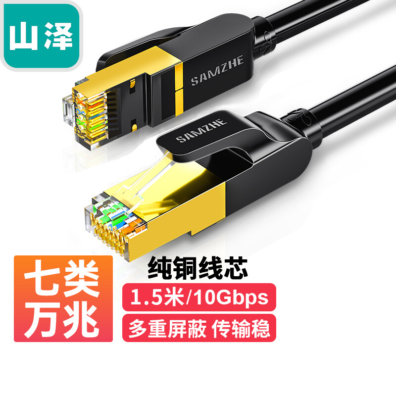 • 山泽(SAMZHE)七类网线 Cat7类纯铜屏蔽8芯双绞线 工程级万兆网络连接线电脑家用成品跳线 黑1.5米CAT-7015H