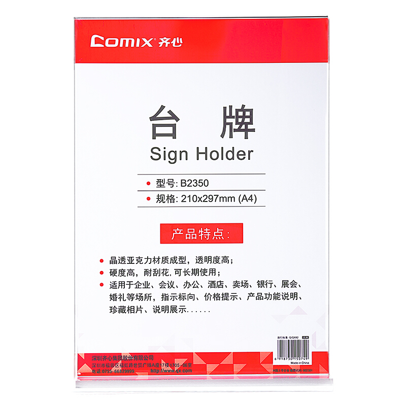 • 齐心(Comix)台牌/桌牌架/台卡/展示牌 高透明亚克力T型A5竖式 B2351