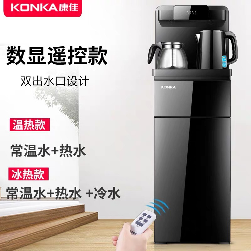 康佳(KONKA)下置水桶全自动饮水机家用办公立式冷热小型桶装水智能茶吧机 黑色+遥控+靠背板 温热