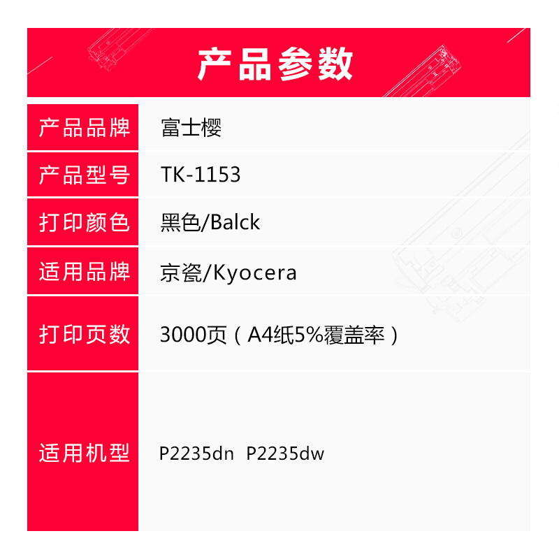 • 富士樱 TK-1153 墨粉盒(适用京瓷Kyocera P2235dn P2235dw)黑色碳粉