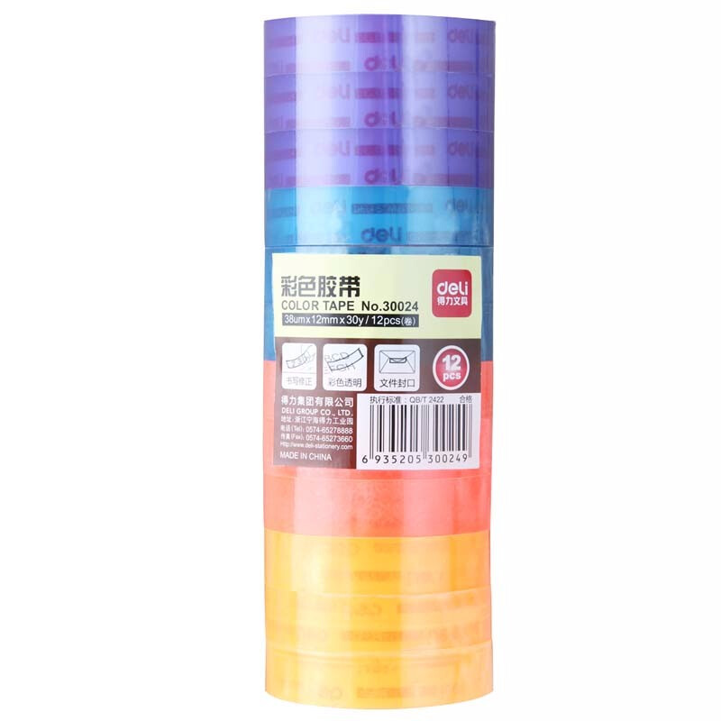 得力学生文具胶带小号胶带 透明彩色胶布 办公用品 宽12mm 12卷/筒 30024