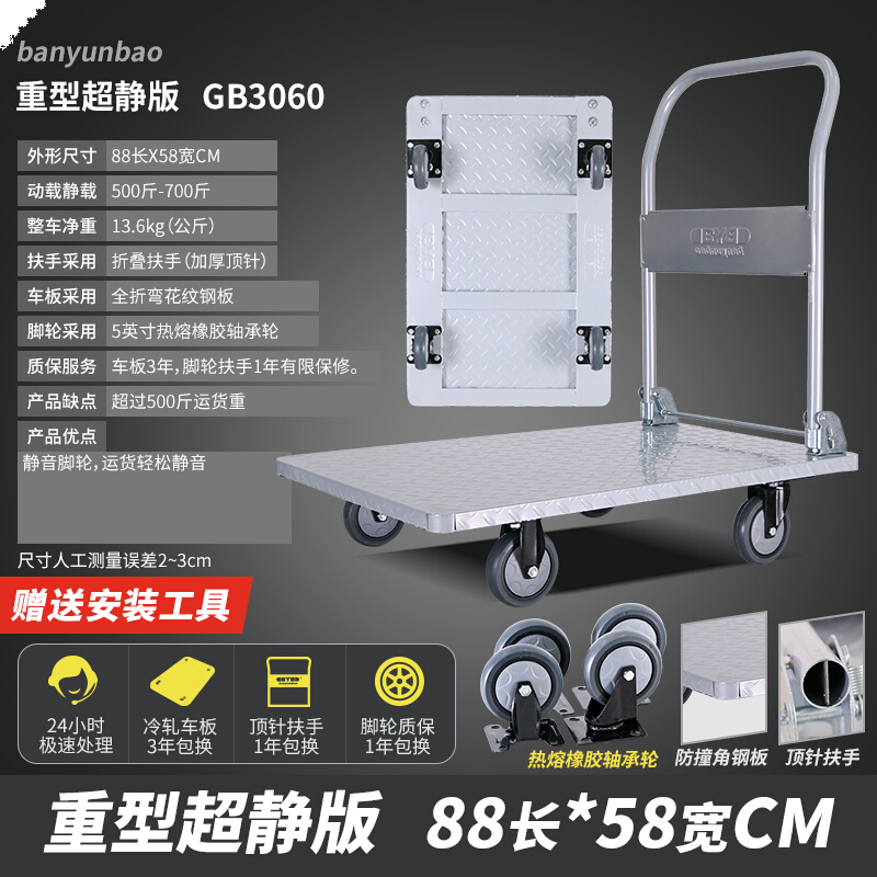 搬运宝钢板平板车折叠小推车手推车拉货车搬运车 重型超静版700斤88X58CM
