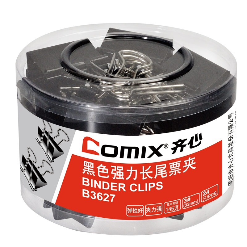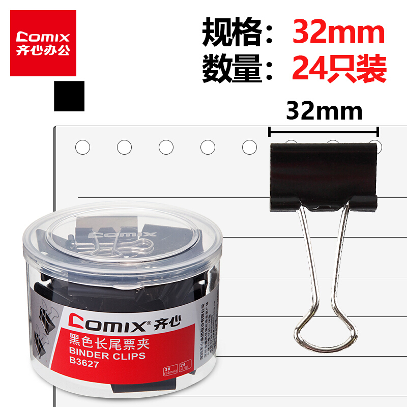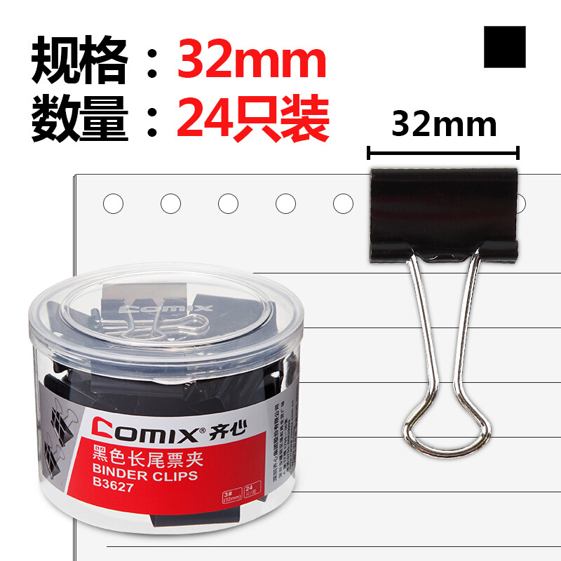 • 齐心 B3627黑色长尾票夹 3# 32mm 24只/筒