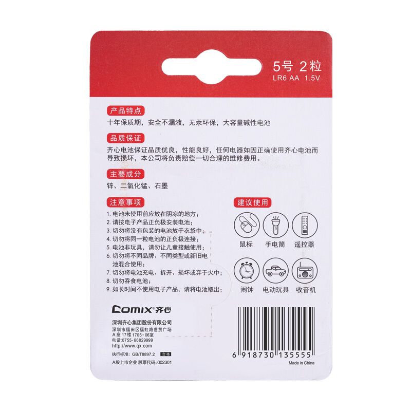 齐心(Comix) 5号 2粒装 安全碱性电池办公用品 C-502