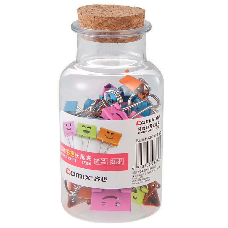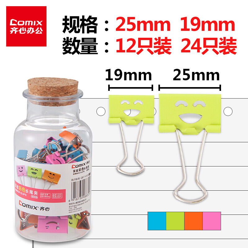 齐心(Comix) 漂流瓶彩色笑脸票夹 长尾夹 (内装25mm12只 19mm24只) B3697