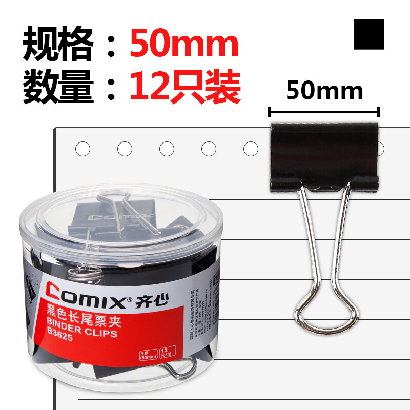 齐心 B3625黑色长尾票夹 1# 50mm 12只/筒 黑