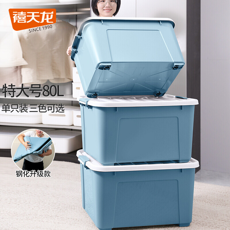 • 禧天龙(钢化升级款)加厚抗压高韧性收纳箱 80升1个装石青色 衣物被子文件书籍儿童玩具整理打包箱特大号