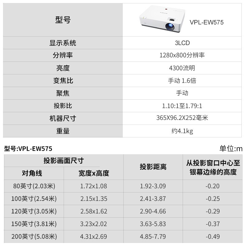 索尼(SONY) VPL-EW575 投影仪 办公高清宽屏投影机 4300流明 内置扬声器