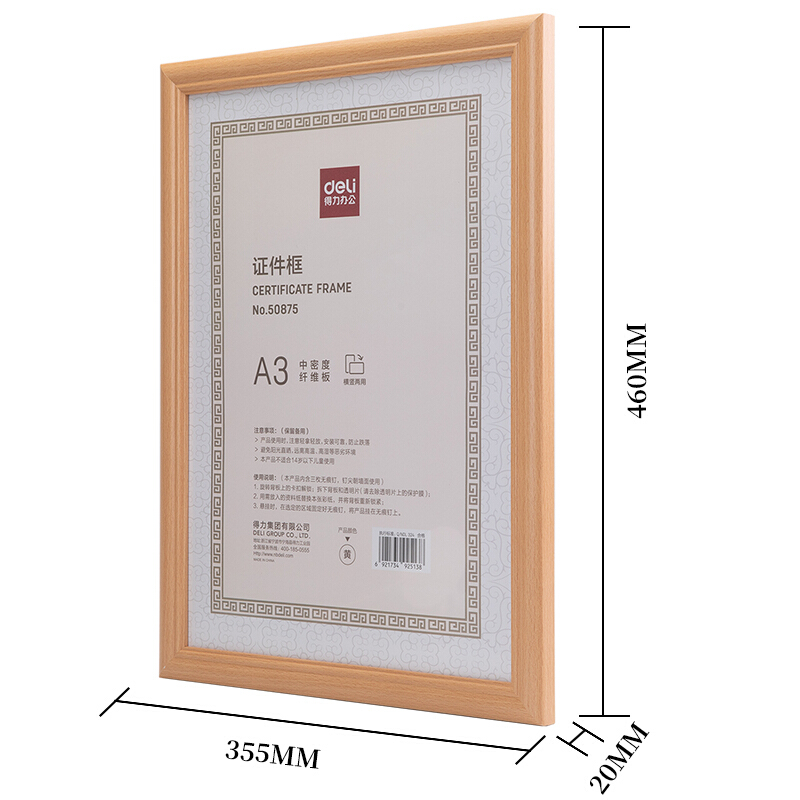 • 得力50875 A3营业执照相框 工商税务登记证框 横竖证件相框画框证书框 黄色