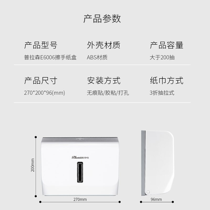 • 普拉森6006 擦手纸盒 卫生间壁挂式免打孔抽取式纸巾盒 白色 免打孔安装