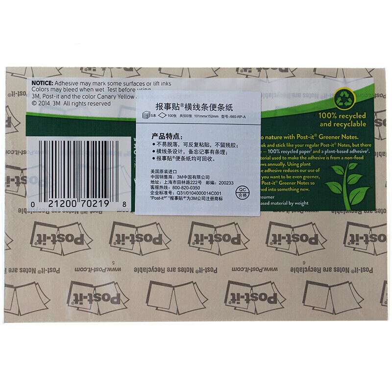 • 3M 660-RP标签纸 签名指示标签 报事贴横线条便条纸 (单本) 颜色随机有要求请备注