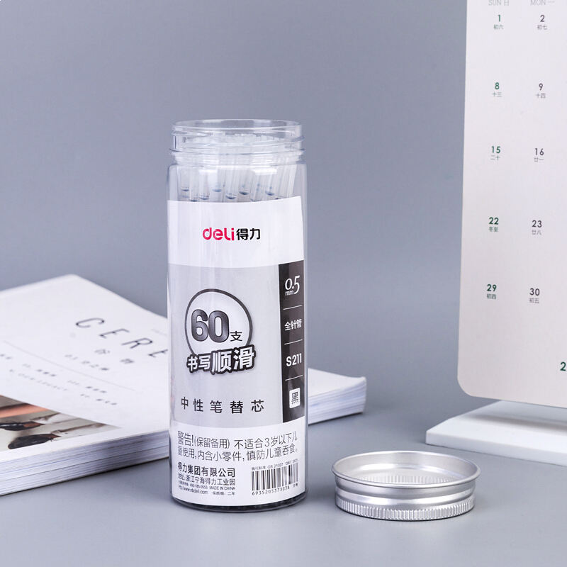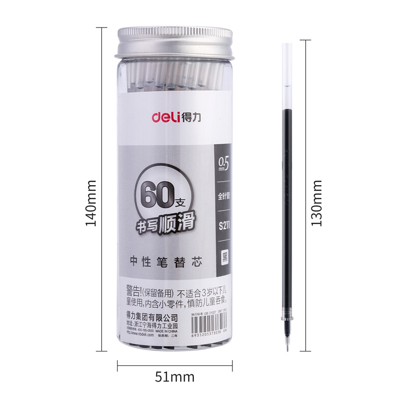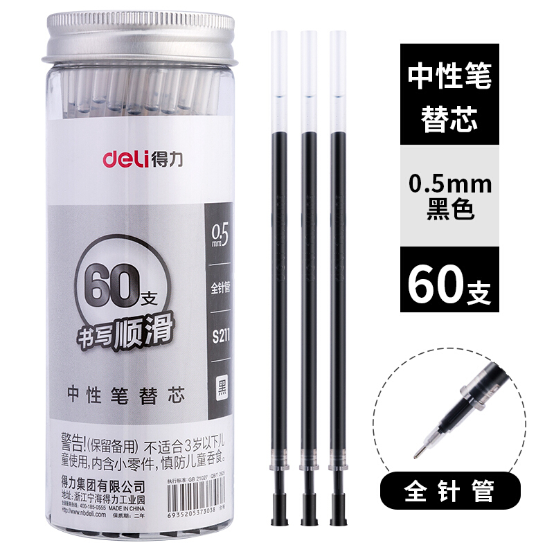 • 得力SX-S211 办公大包装中性笔替芯0.5mm 全针管签字笔芯 60支/桶