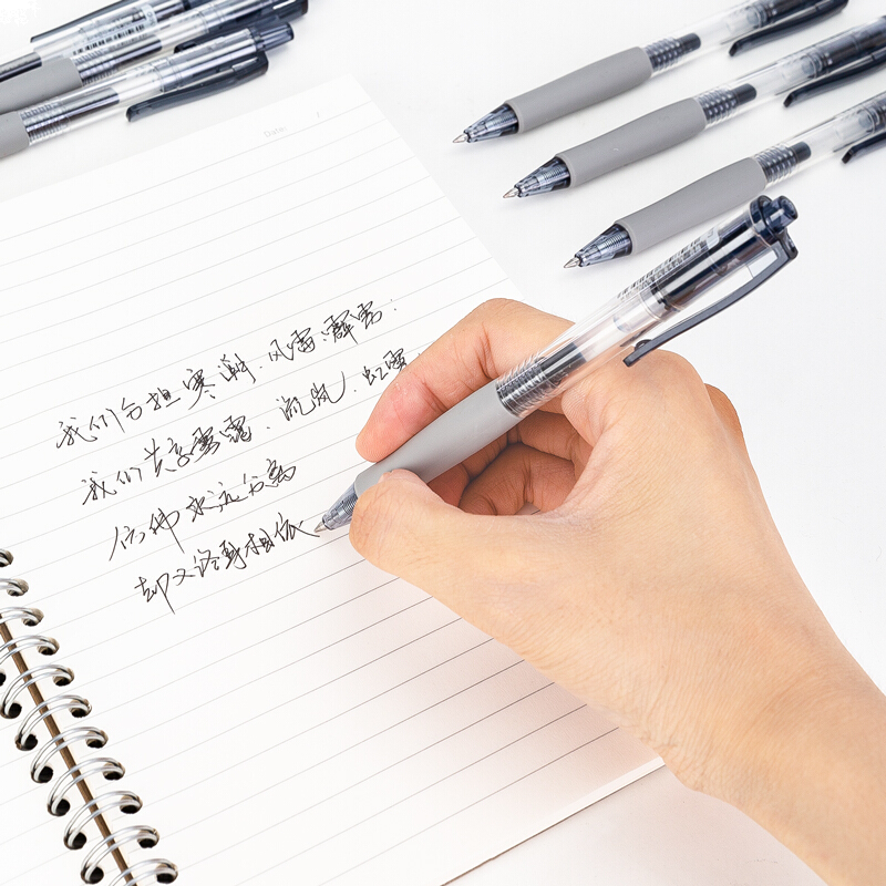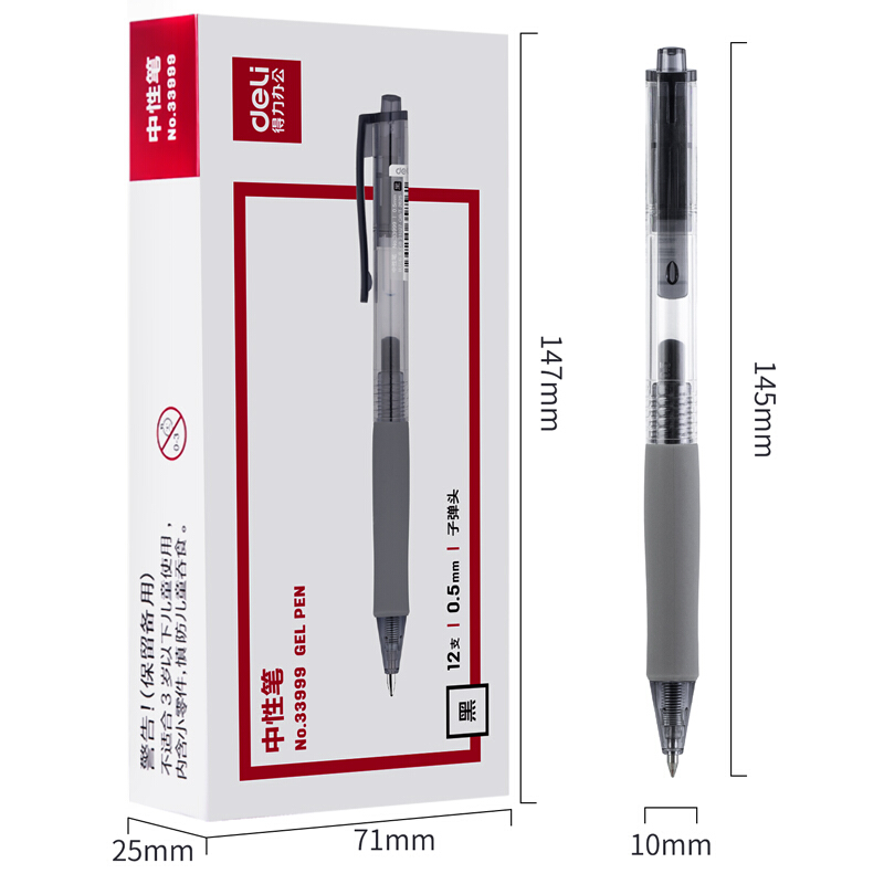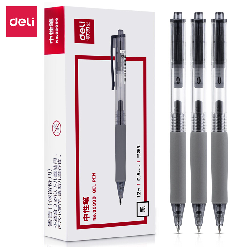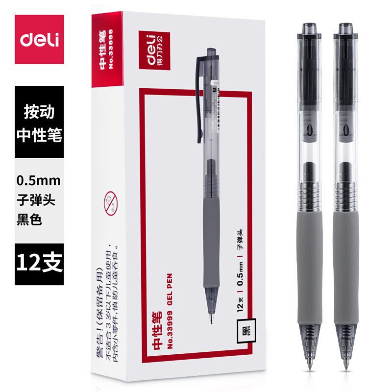 • 得力33999 按动中性笔水笔0.5mm签字笔子弹头黑色12支/盒