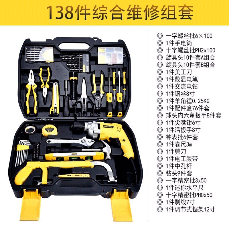 得力DL5966 工具箱套装【电钻综合套装138件套】羊角锤手锯